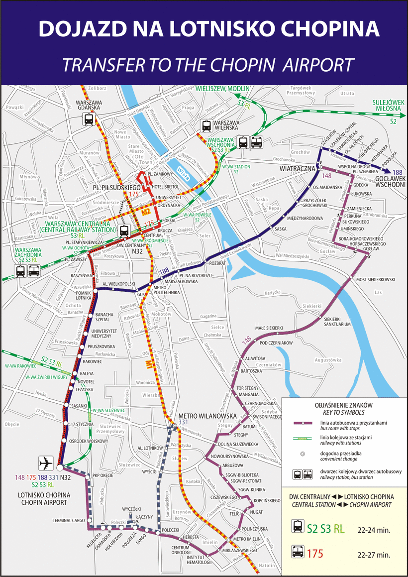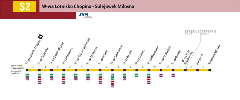 - Скоростной поезд S2 идет из аэропорта до остановки Сулеювек Милосна (Sulejówek Miłosna), проходя через Варшаву Всходню (Warszawa Wschodnia), Средместье (Śródmieście), Повислье (Powiśla) и Варшаву Веселую (Warszawa Wiesoła).