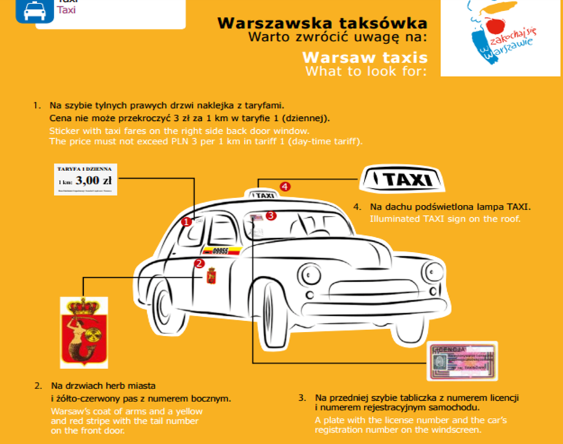 Изучая информацию перед выездом в Варшаву, я очень удивилась, узнав тот факт, что аэропорт Шопена сотрудничает только с тремя фирмами такси. Объясняют это заботой о безопасности путешественников. Более того, службы безопасности аэропорта даже информируют о том, как должен выглядеть автомобиль, соответствующий лицензионным требованиям. Думаю, что эта информация пригодится и вам: