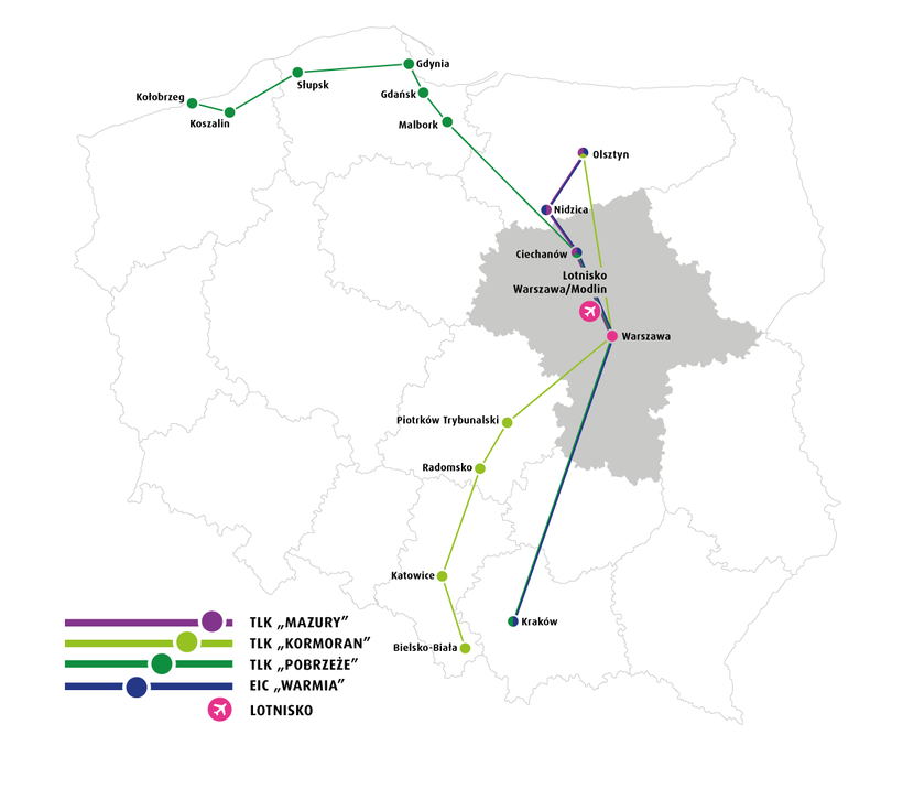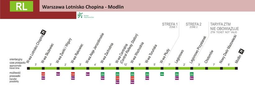 - Поезд линий Мазовецкий следует до станции Модлин через три основных железнодорожных вокзала, Легионово (Legionowo) и Новый Двор Мазовецкий (Nowy Dwór Mazowiecki).