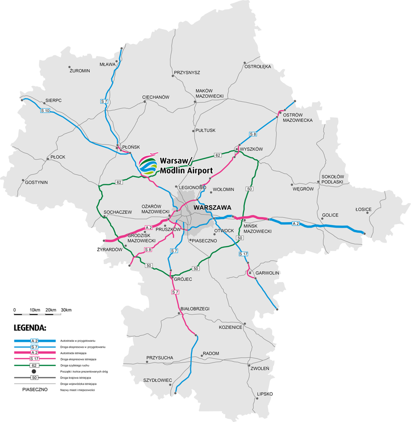 В непосредственной близости от аэропорта находится две важных транспортных магистрали - Автобан С7, соединяющий Гданьск и Краков, а также Государственная дорога номер 2 (обозначается ДК 62) - Стжельно-Вроцлавек-Вышкув-Соколув Подляски-Семятыче (Strzelno - Wrocławek - Wyszków - Sokołów Podlaski - Siemiatycze). По ним тоже можно добраться до столицы, выехав на трассу Е 77. В этом случае поездка займет около 50 минут-часа, по дороге должны встретиться такие населенные пункты, как: