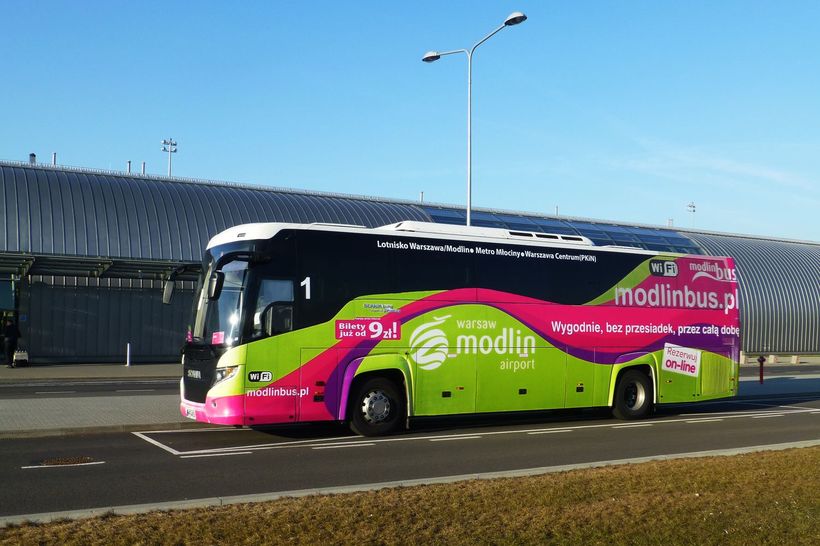 Единственным перевозчиком, который официально совершает подвоз пассажиров из аэропорта Модлин в центр Варшавы - Модлинбус. Выглядят автобусы перевозчика так: