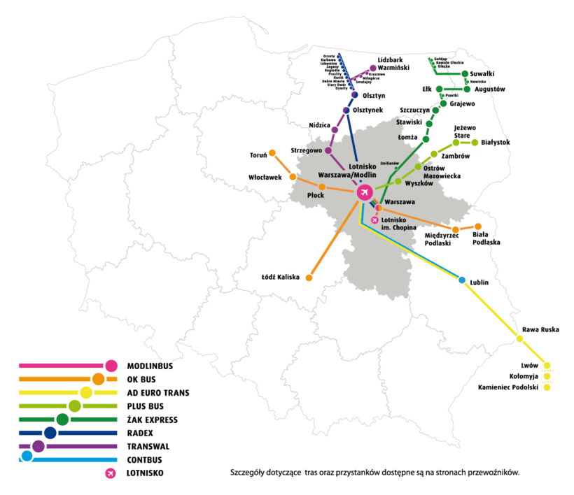 Да, забыла сказать, ОКБУС и Модлинбус сейчас заезжают и в аэропорт им. Шопена. А до Варшавы можно также добраться на транзитных автобусах компаний Radex и Żak Express. Ну а схема автобусного сообщения аэропорта Модлин с польскими городами (в том числе и столицей) выглядит вот так: