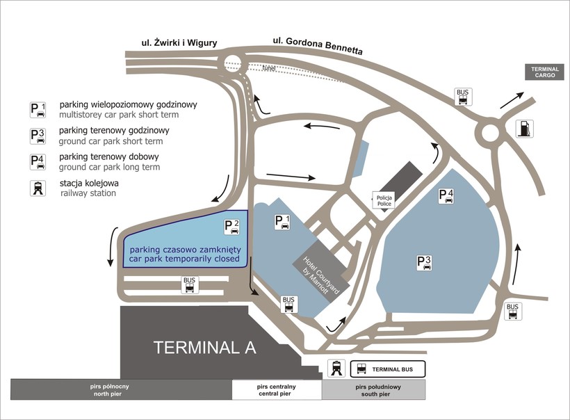 На территории аэропорта находятся 2 паркинга. Кратковременный, рассчитанный на 600 мест, расположен в 50 метрах от терминала. Также авто можно оставить на долговременном паркинге, находящемся приблизительно в 2 километрах от пассажирского терминала в направлении Нового Двора Мазовецкого около все той же 62 трассы. Я рекомендую пользоваться именно этим паркингом, поскольку только на нем имеется быстрый бесплатный трансфер к самым дверям терминала.