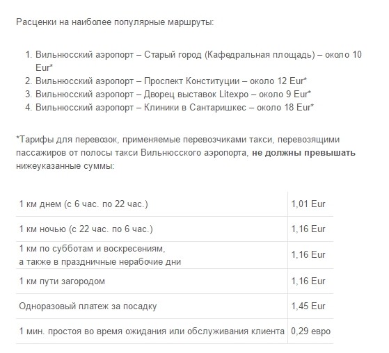 Если вы после перелета уже так устали, что на общественный транспорт нету сил. Можно воспользоваться услугами такси. Я не буду вам рекомендовать различные фирмы. Вильнюсский аэропорт уже обо всем позаботился! Сразу при выходе из терминала прибытия есть выделенная полоса для такси. Можете "брать" любую из этих машин. Вот тарифы: