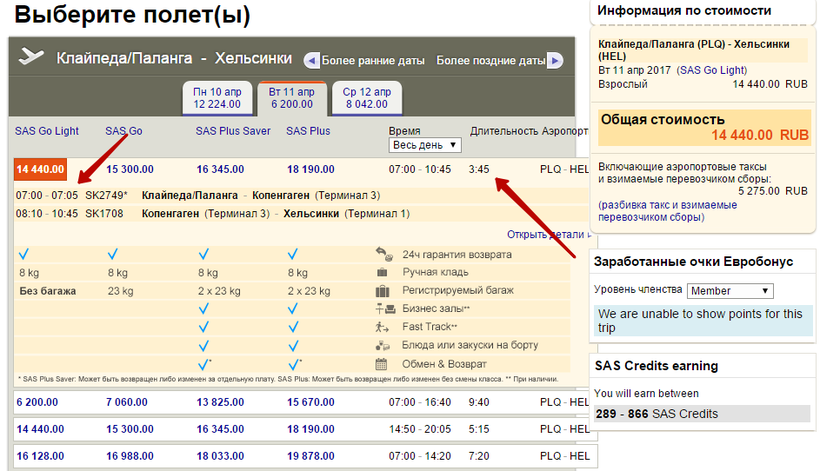 Билеты мы искали через Интернет, и на поисковиках можно часто встретить информацию, что самолёт «SAS airlines» из Паланги в Хельсинки через Копенгаген летит практически столько же, сколько и борт «Airbaltic» через Ригу. Это не совсем так. Я даже специально сделала скриншот, чтобы показать ошибку в расчётах, которые приводятся в Интернете. Длительность рейса указывается как три часа, при этом перелёт из Паланги в Копенгаген занимает 5 минут. Ясно, что дело в часовых поясах, но система почему-то это не учитывает.