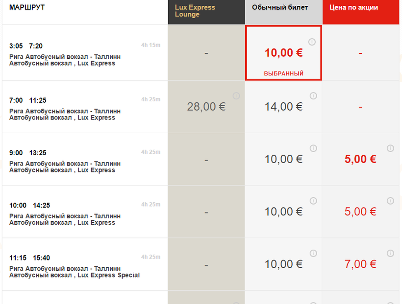 А вот это – расписание «LuxExpress». Как видите, можно купить билеты даже дешевле 10 евро.