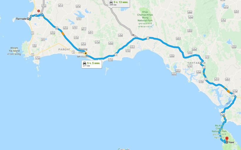 Паттайя — Ко Чанг — маршрут на карте