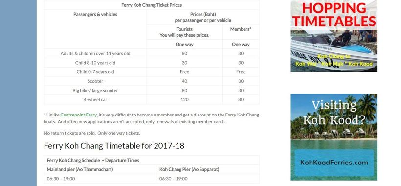Заправок по пути довольно много, так что пользоваться зажигалкой (как в старой советской рекламе «Таврии») вряд ли потребуется. :) В самом конце пути придется совершить морской круиз (хоть и короткий) на пароме. Перевозки осуществляет компания Ko Chang Ferry. Вот скриншот с её официального сайта: