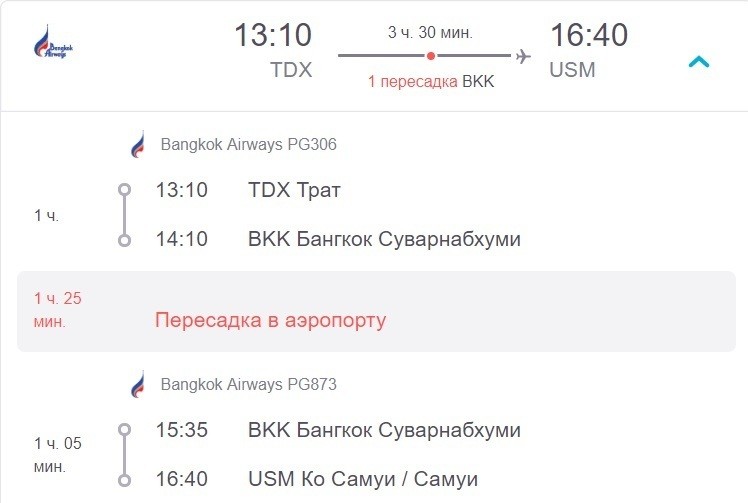 Прямых рейсов из этого аэропорта до Самуи нет, есть вариант долететь только с пересадкой. Ее лучше всего сделать в столице Таиланда — Бангкоке. В дороге нужно провести от трех с половиной часов.