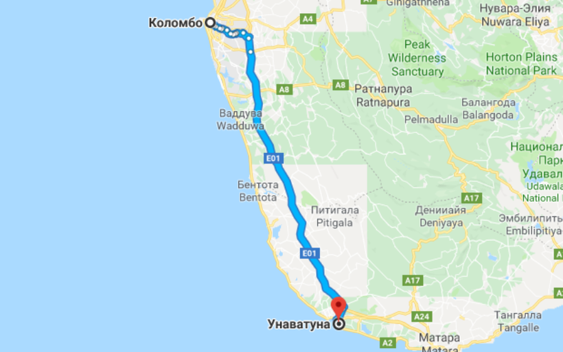 На весь путь на машине до Унаватуны из Коломбо понадобится около 12 л топлива, что обойдется примерно в 1900 рупий (700 руб.).