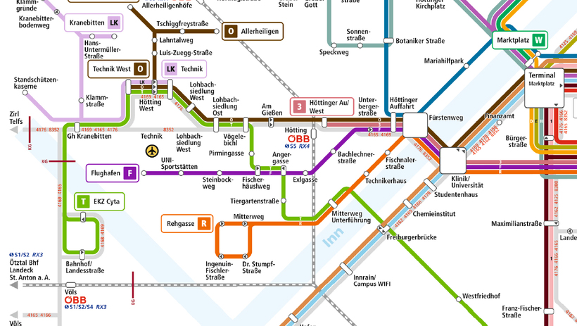 Чтобы добраться в город из аэропорта, можно воспользоваться услугами общественного транспорта. Автобусы линии F каждые 15 минут отправляются от терминала аэропорта Инсбрука и следуют до главного железнодорожного вокзала, который находится в 15 минутах ходьбы от исторического центра. Время в дороге 20 минут. Остановка автобусов рядом с выходом из здания аэропорта. На лобовом стекле сверху справа или слева ищите букву F.