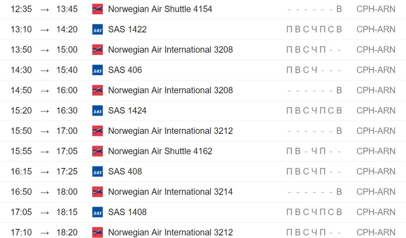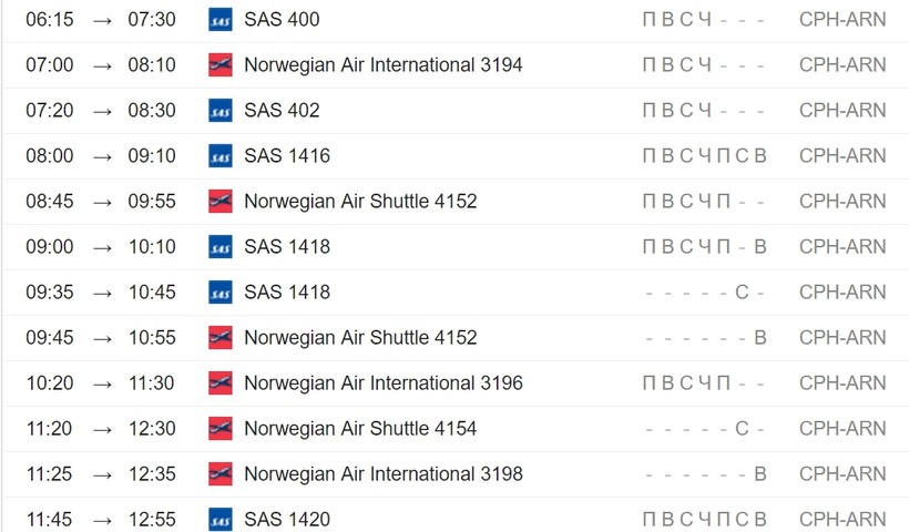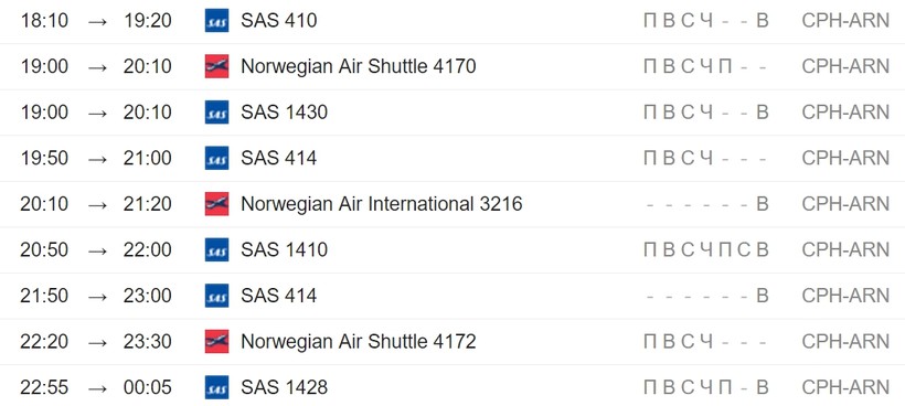 В Стокгольм можно вылететь с 6:15 утра до 22:55.