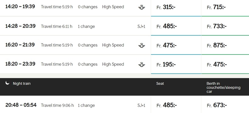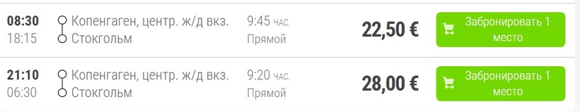 Ниже приведена информация о том, сколько часов вам потребуется, чтобы добраться от Копенгагена до Стокгольма, а также приведена примерная стоимость проезда (средняя цена билета) на том или ином виде транспорта.