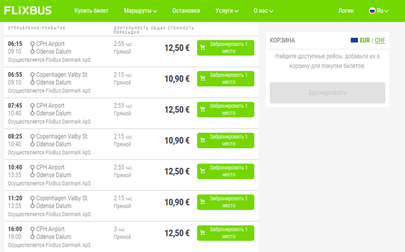 Кусок расписания с сайта FlixBus Из Копенгагена в Оденсе на поезде