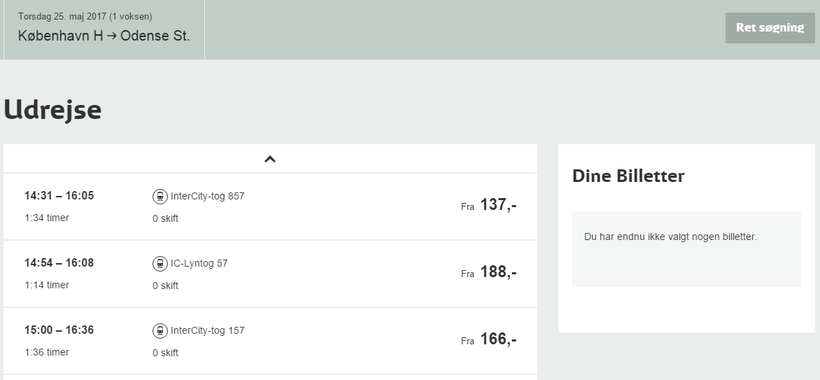 В Дании есть много ценовых категорий для билетов, поэтому точную стоимость назвать трудно. Цена зависит от возраста пассажира, есть билеты на группу из 10 человек, абонементы на несколько поездок. Места в поезде распределены на первый и второй класс. Обычный билет на взрослого человека стоит примерно от 140 крон (19 евро).