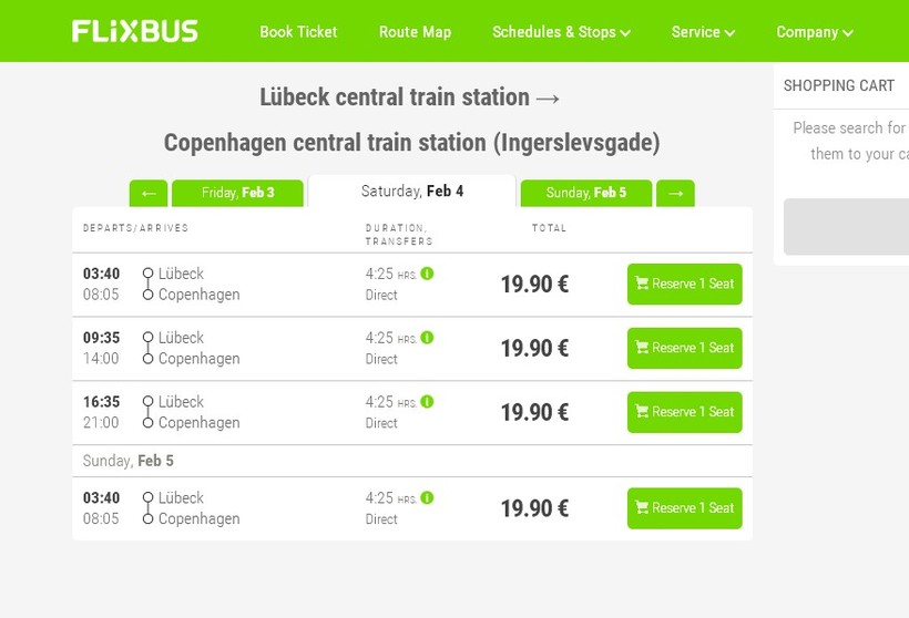 В Копенгаген из Любека ходит автобус компании FlixBus. Отправляется с Lübeck central train station, а прибывает на Copenhagen central train station (Ingerslevsgade). Ходит такой автобус три раза в день. В 3:40 ночи, в 9:35 утра и в 16:35 после полудня. В пути он находится 4 часа 25 минут, включая время проезда на пароме. Автобус прямой, без пересадок. Расписание можно посмотреть на сайте компании FlixBus.