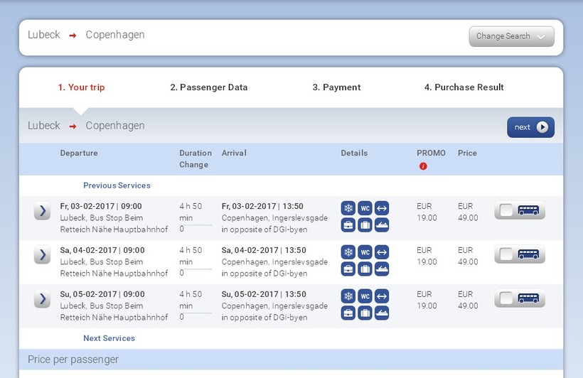 Так же из Любека в Копенгаген можно доехать автобусом Eurolines. Ходит он один раз в день, с отправлением в 9:00 утра. В дороге он находится 4 часа 50 минут, потому что заезжает еще в Nykobing Falster. Паромная переправа входит в это время. Пересадок у этого рейса нет.