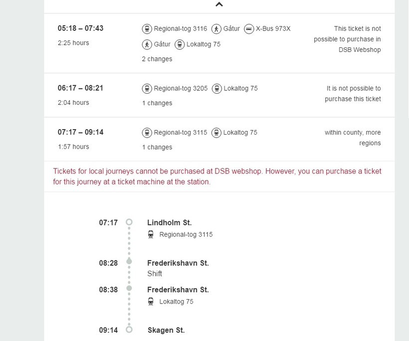 Поезда в нужном направлении ездят практически круглосуточно, только с одной пересадкой можно добраться, если сесть в Копенгагене с 7:00 до 18:00. В целом схема проезда довольно простая: садитесь в поезд в Копенгагене и выходите на конечной в Фредериксхавне, следующий поезд также едет от конечной до конечной. Вокзал в Фредериксхавне маленький, буквально 2 платформы, поэтому 20 минут вполне хватило, чтобы перейти в другой поезд.