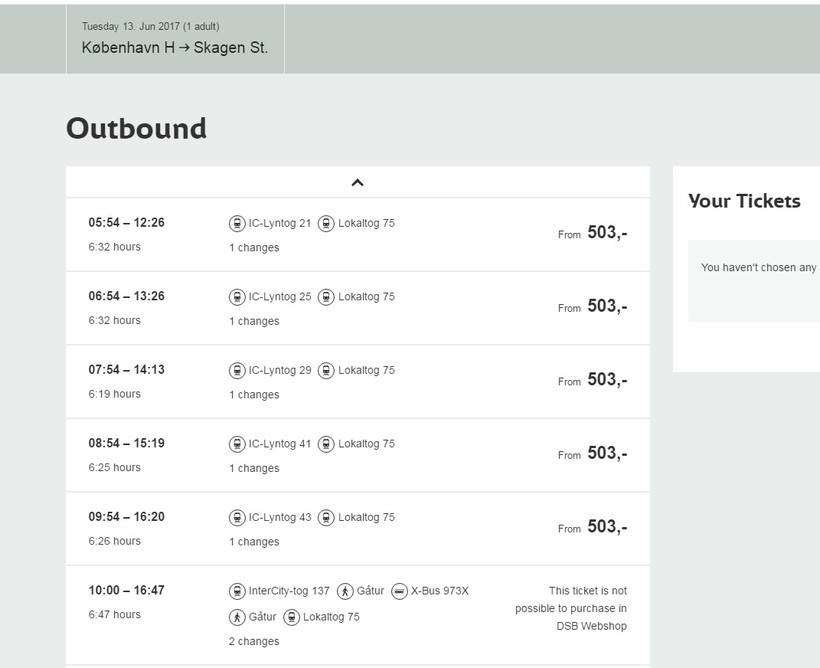 Поезда с одной пересадкой в городе Фредериксхавн (Frederikshavn) начинают ездить с 6 утра и до 10 вечера, поездка займет 2 часа. Есть еще варианты проезда из Ольборга в Фредериксхавн на автобусе, но потом все равно придется сесть на поезда в Скаген. Если интересно, информация есть на сайте железной дороги, но мне кажется проще пересесть с одного поезда на другой.