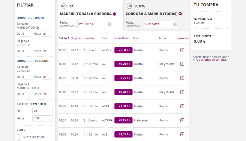 Все поезда отправляются с мадридского вокзала Аточа (это самая крупная ж/д станция города), а адрес его Plaza Emperador Carlos V. Первый поезд доступен для посадки уже в 06.20. Курсируют все поезда с интервалом от двадцати минут до часа (как правило, утром рейсов представлено больше). Последний поезд, которым можно воспользоваться, отправляется в 21.25. Найти полностью все расписание движения ж/д транспорта по маршруту Мадрид - Кордова можно очень просто на веб портале перевозчика Renfre.