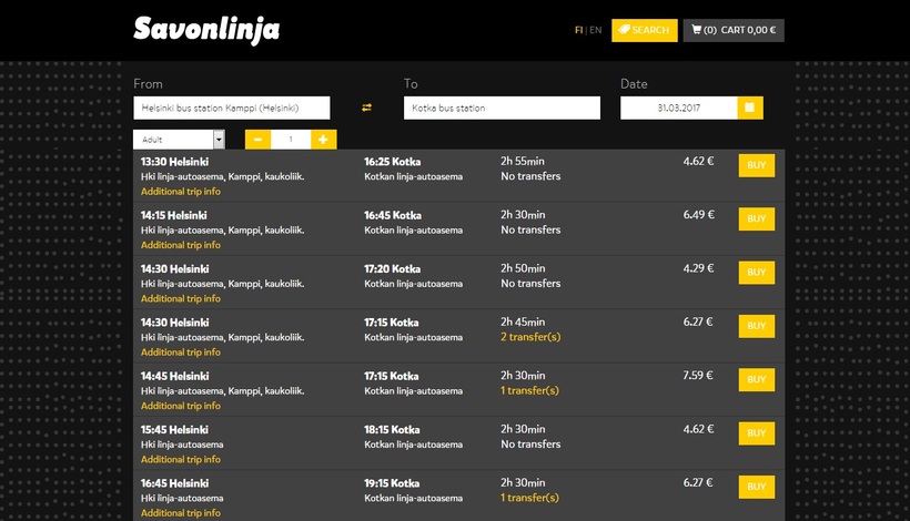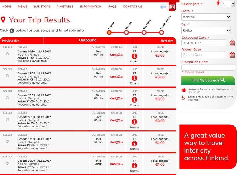 Прибыв на автовокзал, я отправила мужа в кассу взять билеты на любой ближайший рейс в Котку. Не знаю, как у супруга это получилось, но он приобрел два самых дешевых билета на рейс компании Onni Bus. Наверное, финский втихаря смог выучить :). Вот расписание рейсов этого перевозчика.