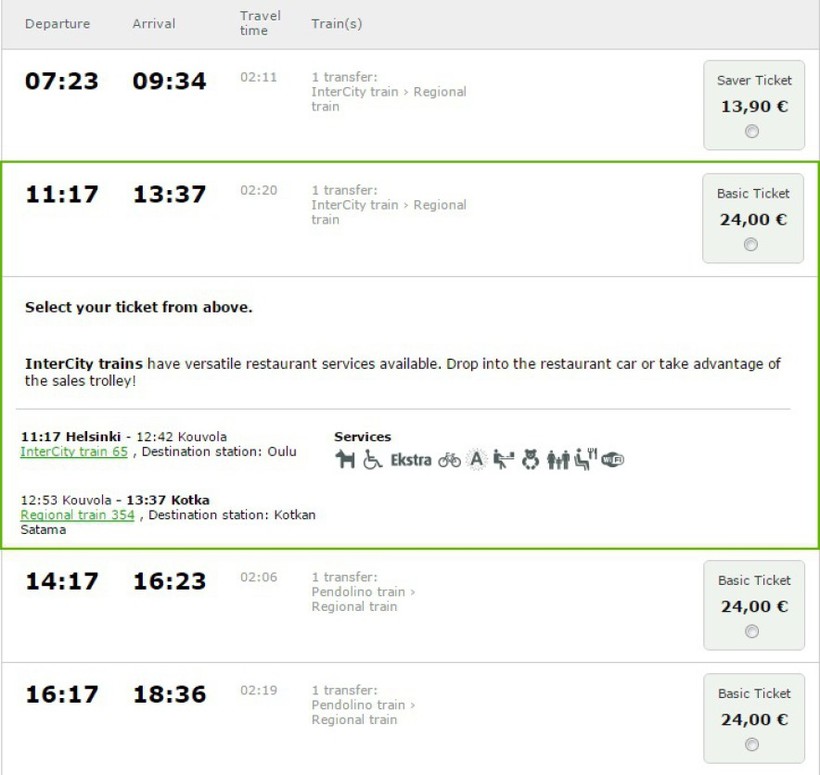 Из Хельсинки в Котку на поезде можно добраться с пересадкой на станции Kouvola. Вот фрагмент расписания.