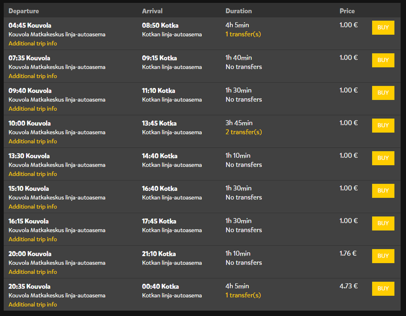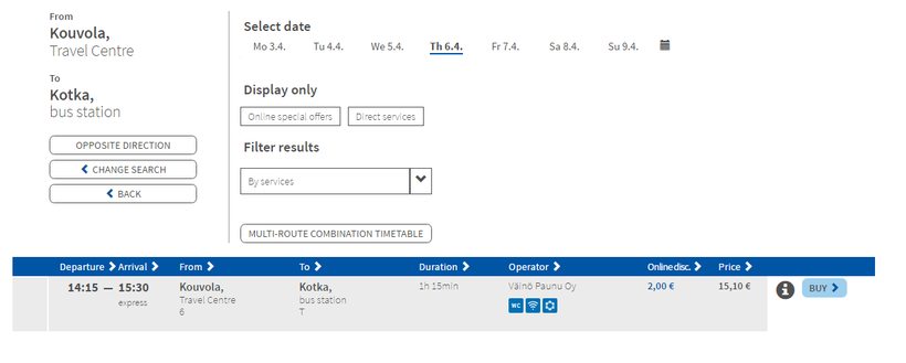Благодаря тому, что Коувола и Котка находится совсем близко друг от друга, то я даже не переживала за транспорт, которым буду путешествовать. Я была на сто процентов уверена, что автобусы и поезда точно курсируют по такому маршруту)). И не прогадала.Первый вариант, о котором и хочу вам рассказать, - автобусы. Их не так много, как хотелось бы. Так как я планировала свою поездку, пользуясь Интернетом, то нашла несколько перевозчиков, что обслуживают этот маршрут. Вот три из них:
