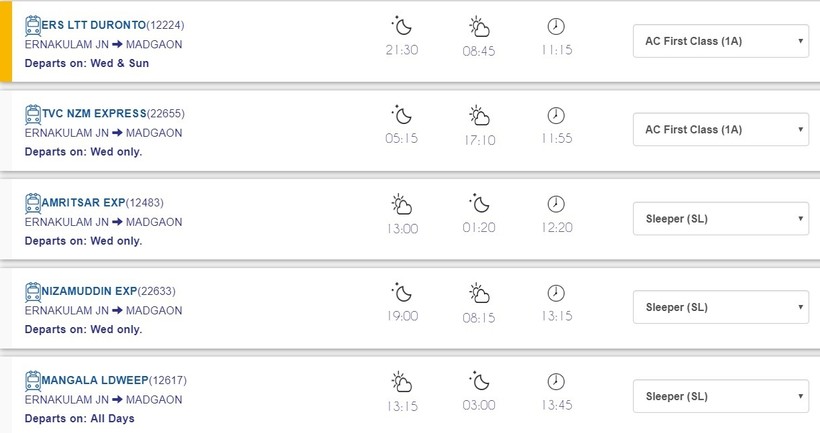 Большинство поездов, следующих в Маргао, имеет только три класса вагонов:
