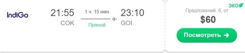 Билет на самолет в Гоа стоит от 60 долларов (от 4176 рупий или 3820 рублей).