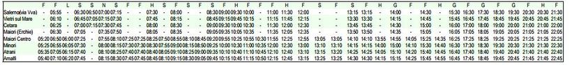 Добравшись до вокзала в Салерно, следует садится на автобус вышеупомянутой компании SitaSud и ехать до Амальфи под номером... да, таки снова 5120. Признаться, я и сам в шоке от этой системы, и как итальянцы в ней не путаются? Ладно, нам не шашечки номер, а ехать, поэтому надо снова-таки заглянуть в ближайший бар и купить там билет на автобус. Остановка автобуса располагается рядом с железнодорожным вокзалом, на улице Via Leonino Vinciprova. С расписанием автобуса можно ознакомиться либо на сайте компании, либо на скриншоте ниже: Далее схема уже описанная выше: нужно дождаться автобуса до Равелло, сесть в него гордо козырнув билетом-абонементом, и прибыть в пункт назначения.