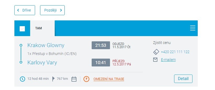 На дневном поезде ехать совсем неудобно, он отправляется в 10:20 и прибывает в Прагу в 17:39, ближайший прямой поезд в Карловы Вары отправляется в 5 утра. В течение суток всегда можно подобрать варианты с пересадками, но как правило их даже не две, а четыре, пять и даже шесть!