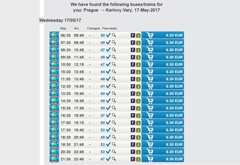 Автобусы в Карловы Вары ездят с утра до вечера, в общей сложности поездка на автобусах займет не менее 10 часов.