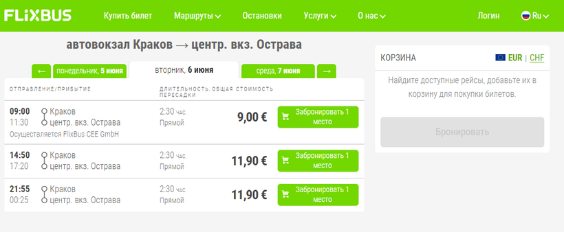 - FlixBus. Три рейса в день: в 9:00, в 14:50, в 21:55.