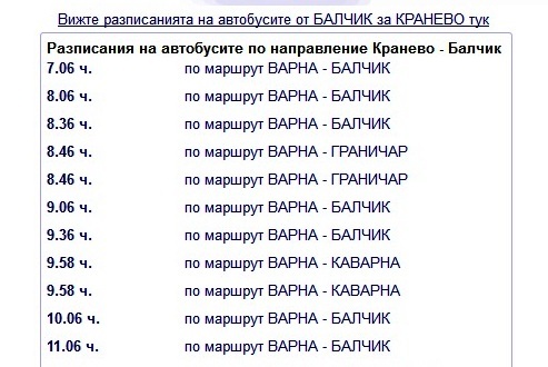 Автобусов, идущих непосредственно из Кранево в Балчик нет. Но всегда можно выйти на остановку или шоссе и поймать автобус, следующий из Варны в Балчик, Граничар, Коврану или Шаблу. Строгого расписания у автобусов нет. Но из Варны они отходят с промежутком примерно раз в час. Соответственно и через Кранево следует с тем же промежутком.