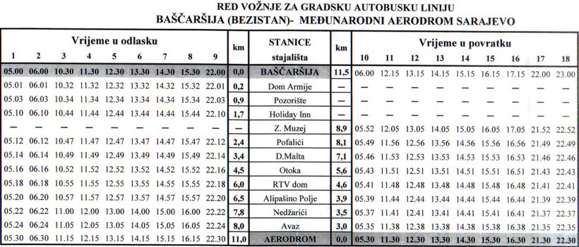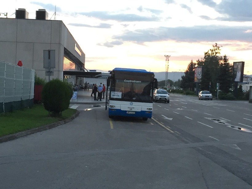Если нужно добраться до города, то автобус является наиболее дешевым и удобным вариантом поездки. Ранее от аэропорта ходил автобус с номером 200Е, но вот уже более двух лет по данному маршруту автобус не ходит. Некоторое время нужно было топать до остановки в километре от аэропорта, но теперь ситуация в корне изменилась. Транспортная компания Centrotrans Eurolines запустила рейсы по маршруту от аэропорта в исторический центр города, до остановки именуемой Baščaršija. Остановка автобуса находится прямо возле терминала и там стоит соответствующий знак:
