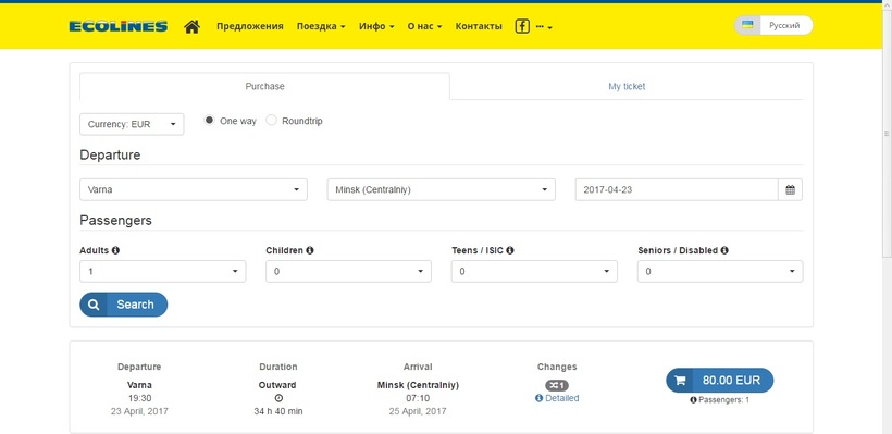 - Билет на автобус Еcolines можно приобрести на сайте или в кассах компании.