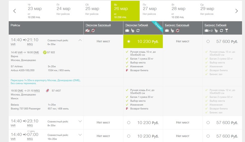 Ближайший к Кранево аэропорт расположен в Варне. Правда, прямых рейсов из аэропорта Варны в Минск нет. Лететь придется с одной или несколькими пересадками. Как по мне, то самым оптимальным по стоимости и времени является полет рейсом компании «S7 Airlines» через Москву. Вот фрагмент расписания.
