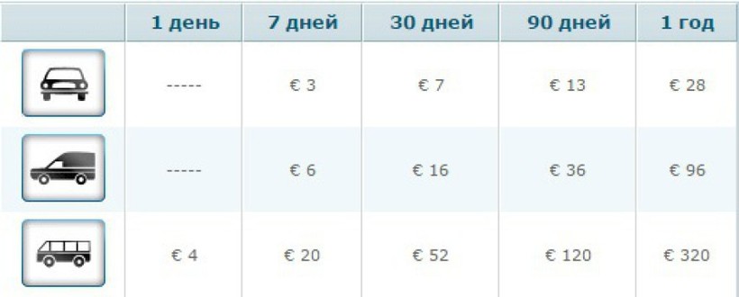 Паромы курсируют с шести утра до десяти вечера. Проезд по дорогам Румынии возможен только при наличии виньетки. Стоит она от 3 евро. Вот таблица с тарифами.