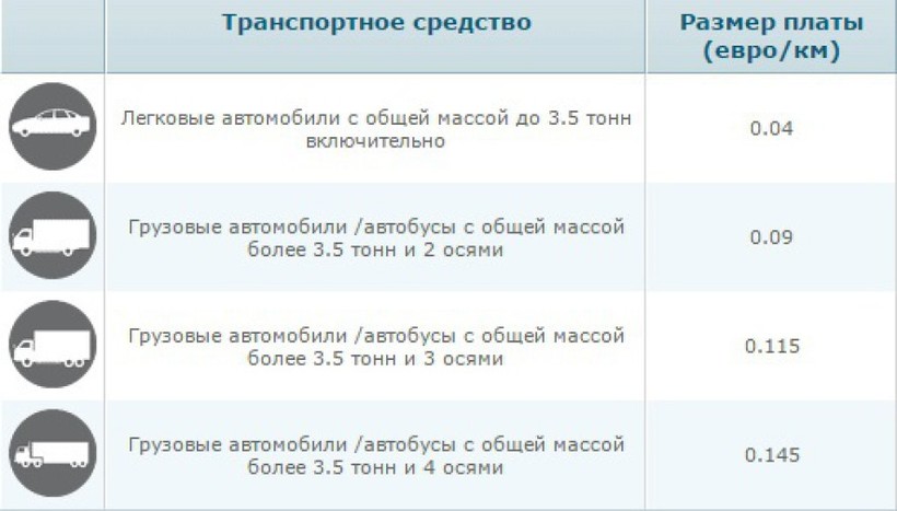 Размер платы зависит от массы транспортного средства и пройденного расстояния.