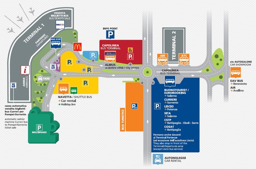 Данный аэропорт имеет два пассажирских терминала, но терминал №2 ориентирован больше под обслуживание чартеров, поэтому скорее всего по выходу из самолета придется иметь дело с терминалом №1. Внутри терминала есть все необходимое для путешественника, а именно магазин дьюти-фри, обменные пункты и довольно большое количество ресторанчиков и кафе. Лично я бы порекомендовал посетить пиццерию Fratelli La Bufala, тут довольно большой ассортимент блюд, притом достаточно вкусных. Также есть почтовый офис, служба багажа и прочее. При желании получше познакомиться с собственно аэропортом прошу на его официальный сайт, а я перейду к описанию поездки в Сорренто. Ниже прилагаю план аэропорта и окрестностей.