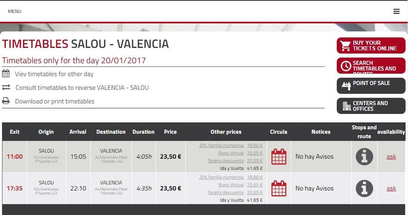 Автобусы компании также достаточно комфортабельны для поездки в Валенсию длиной в несколько часов. Но честно говоря, данный вариант не очень удобен в силу того что рейсов всего лишь два в день. Они отправляются в 11:00 и в 17:35, прибывая в Валенсию, соответственно, в 15:05 и в 22:10. Прибывают автобусы на автовокзал в Валенсии по адресу Carrer de Menéndez Pidal, 11. Скрин расписания: