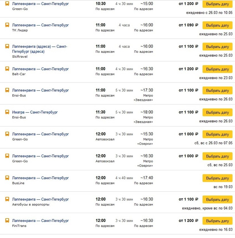 Ниже приведена информация о том, сколько часов вам потребуется, чтобы добраться от Лаппеенранты до Санкт-Петербурга, а также приведена примерная стоимость проезда (средняя цена билета) на том или ином виде транспорта.