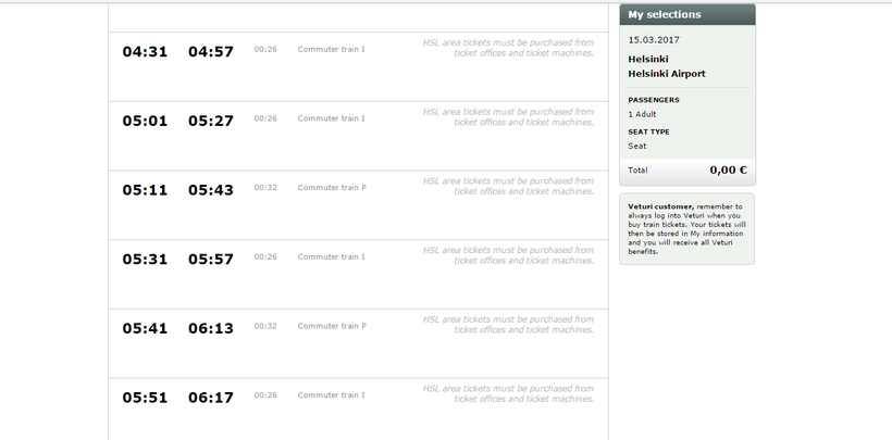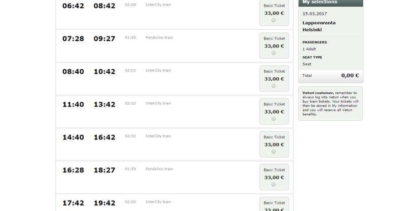 Билет на поезд стоит 33 евро. В общем-то для Финляндии это не очень дорого, хотя я к этим ценам за год жизни в стране так и не смогла привыкнуть. Купить билет можно либо в кассе (лучше напишите на бумажке, куда и когда вы хотите уехать во избежание недоразумений), через терминал или через интернет. Сайт имеет англоязычную версию, так что купить билет не составит труда. Распечатывать билет необязательно, его можно просто скачать на телефон.