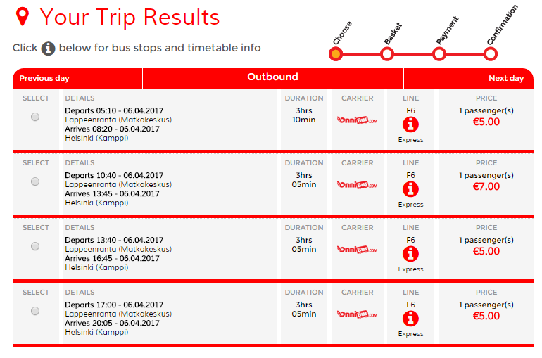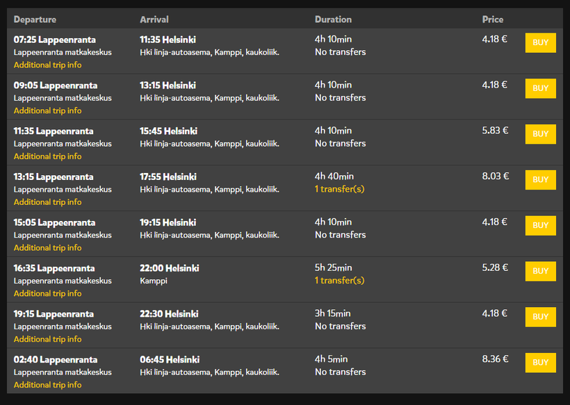 Доехать в финскую столицу из Лаппеенранты можно на автобусах. Маршрут обслуживает несколько компаний, в том числе: