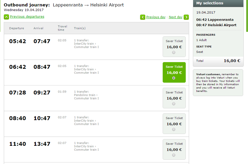 Билеты на поезд от Лаппеенраанты до Хельсинки лучше всего покупать через официальный сайт финских железных дорог, там можно составить сложный маршрут, так что конечным пунктом выбирайте сразу же аэропорт.