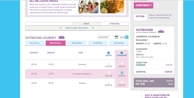 Билет на паром для водителя и легкового автомобиля обойдется от 91 евро или 80 фунтов (для утреннего и дневного рейса по более дешевому тарифу) до 193 евро (для ночного рейса с тарифом Standard). Путешествие с мотоциклом обойдется от 58 до 125,50 евро.