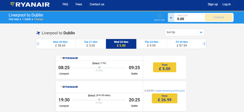 Рейсы авиакомпании Ryanair вылетают из Ливерпуля три раза в сутки: в 08:25, 19:30, 22:10. Перелет занимает ровно час.