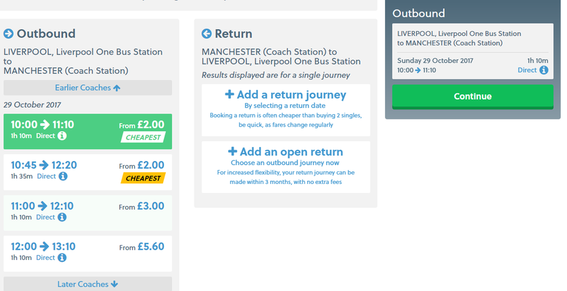 Ниже приведена информация о том, сколько часов вам потребуется, чтобы добраться от Ливерпуля до Манчестера, а также приведена примерная стоимость проезда (средняя цена билета) на том или ином виде транспорта.
