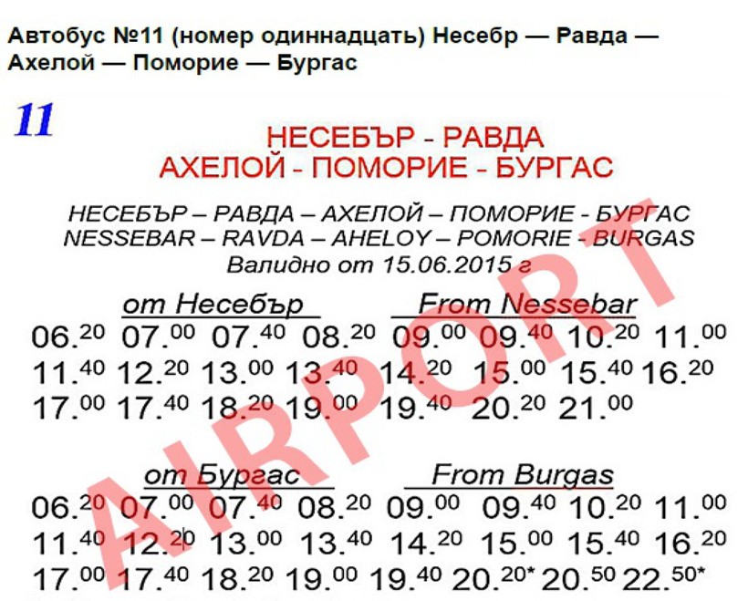 Как оказалось, остановка автобусов в направлении Несебра расположена практически напротив аэропорта через дорогу. Не перепутайте ее с остановкой, которая расположена сразу за автомобильной стоянкой аэропорта возле эстакады. Отсюда автобусные рейсы №11 отправляются на Бургас. Вам необходимо перейти на другую сторону дороги. Мы автобус прождали около десяти минут и после посадки через полчаса были в Несебре. Расписание автобусов есть на остановке. Рейсы курсируют в летнее время с 06.40 до 23.10, зимой расписание меняется. Вот расписание автобусов в Несебр от автостанции Юг в Бургасе.