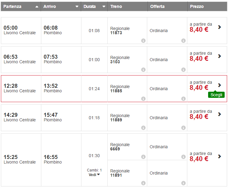 Удивительно, но к Пьомбино, расположенном так недалеко от Ливорно, электрички курсируют не так уж и часто. Из центрального вокзала Ливорно поезда отправляются в 05.00, 06.53, 12.28, 14.29, 15.25 (предусматривается пересадка), 16.25 (тоже с пересадкой), 17.12. Как видите, маршрутов не так уж и много (отчасти, наверно, это связано с тем, что ветка Ливорно-Пьомбино тупиковая), поэтому лучше запланировать заранее, во сколько вы хотите выехать. В дороге нужно будет провести около 1,5 часов. Поездка займет так много времени из-за того, что поезд по дороге останавливается едва ли не на каждом полустанке.